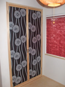 和室の入口はアクセントをつけ、押入の扉は襖せはなくお施主様の選んだクロスを貼ってお洒落に仕上げました。