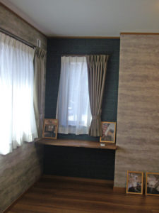 寝室は落ち着いた雰囲気…。コーナーの一角にカウンターをつけクロスを変えました。